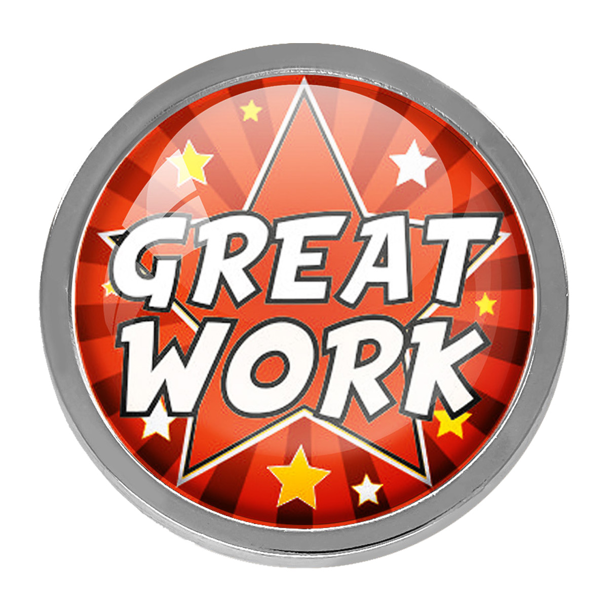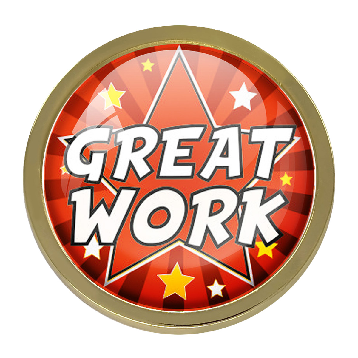 High Quality Metal Star Great Work Badge (22mm). Great work deserves to be noticed in the right way. So why not do it with this unique, eye catching Great Work round badge. Comes with a domed finish. Fast Delivery in 2-3 Working Days.